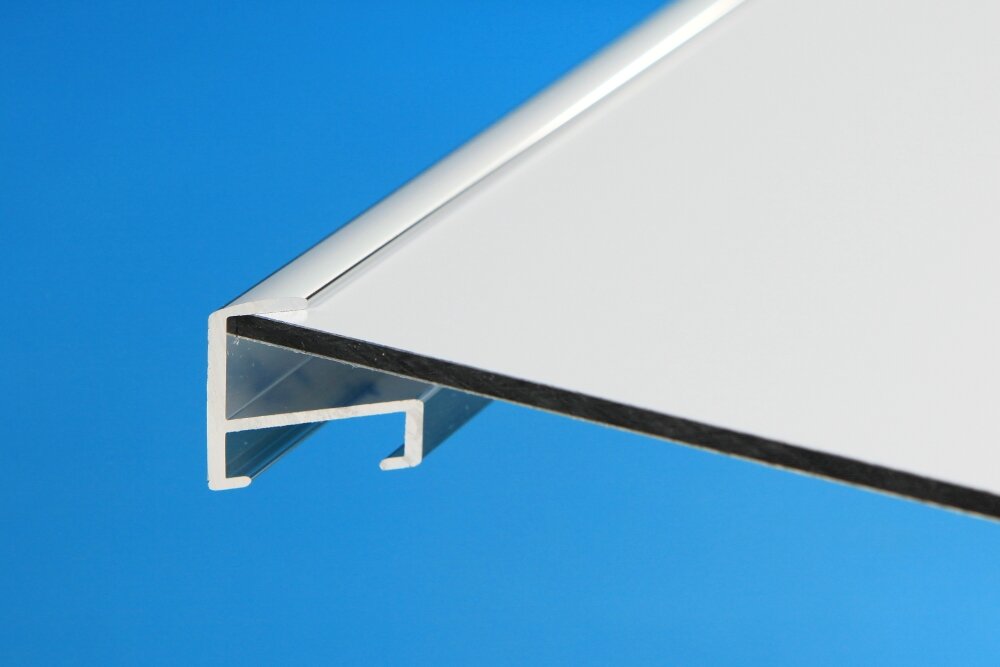Kantenschutzrahmen aus Aluminium im Querschnitt und als kompletter Rahmen.